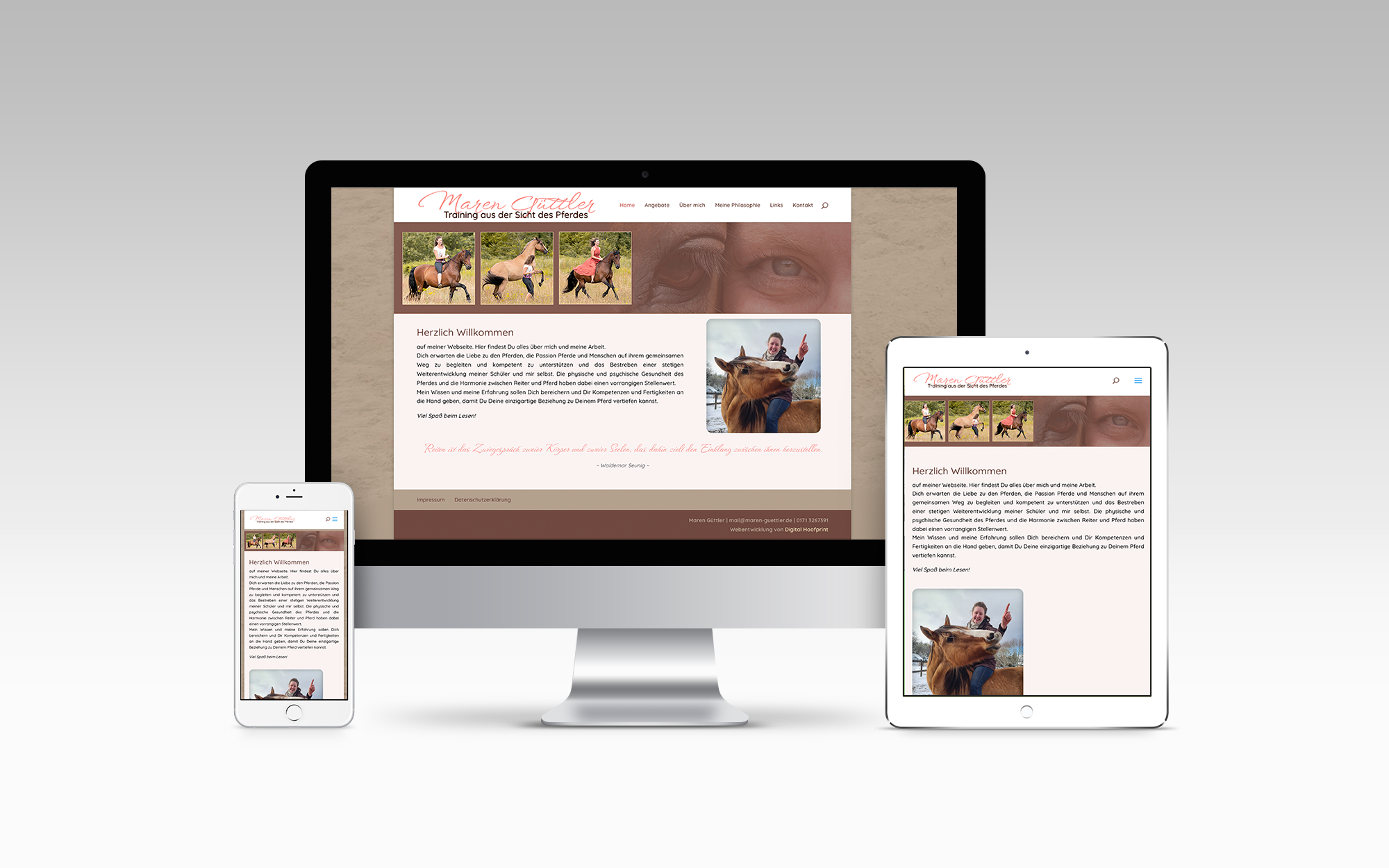 Ich bin seit 1999 im Bereich Webdesign und Online-Medien aktiv, habe einen Bachelor-Abschluss in Creative Media Arts – Pferde begleiten mich seit meiner Kindheit.